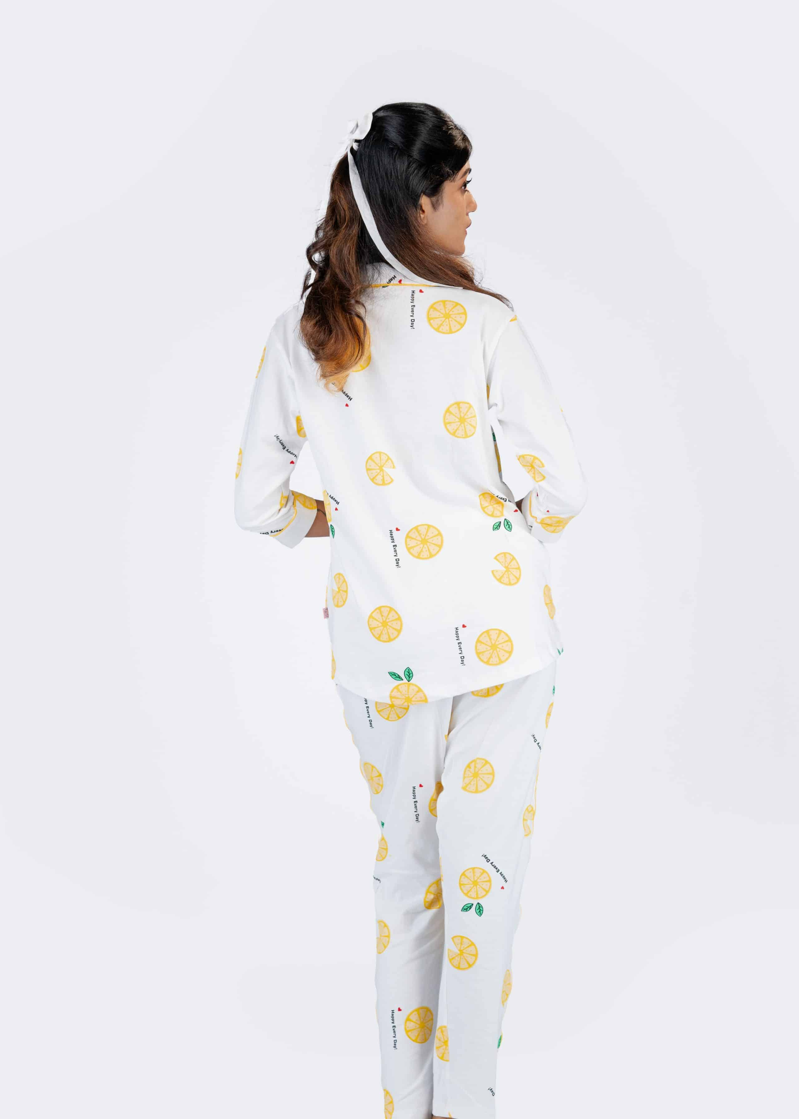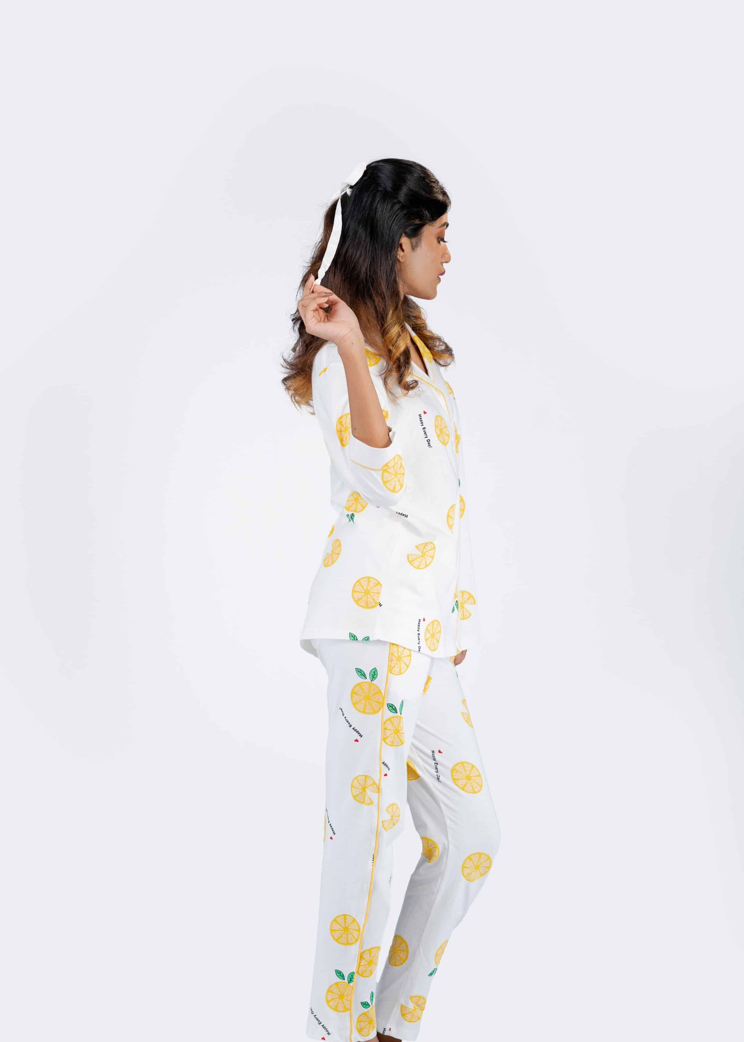 Leafy Mandarin White Pyjama set | Notched Collor | 100% Pure Cotton | Bio-Washed | Manufacture to Consumer Direct sale